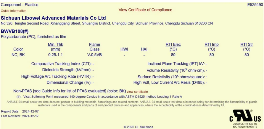 力博为是一家专业从事多功能高分子复合材料及功能母粒研发、制造及销售的企业,其主导产品为无卤阻燃PP薄膜、无卤阻燃PC薄膜和PFAS FREE薄膜,共涵盖三大类、10余个品类。此次荣获UL Solutions Non-PFAS证书的BWVB108聚碳酸酯阻燃薄膜,阻燃等级可达5VB,厚度在0.25mm-1.0mm之间的薄膜能实现从V-0到5VB的阻燃性能提升,并且满足最新的Non-PFAS环保要求。